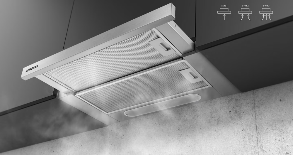 Campana telescópica Samsung NK24M1030IS (60 cm, acero inoxidable): potencia de extracción de hasta 392 m³/h, filtro de aluminio lavable, 3 velocidades y luz LED—ideal para mantener tu cocina limpia y ventilada.