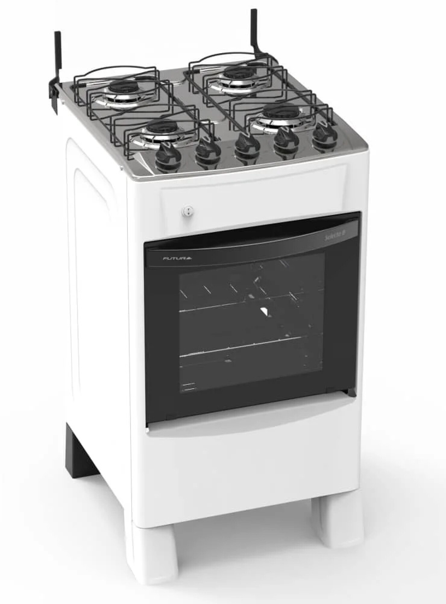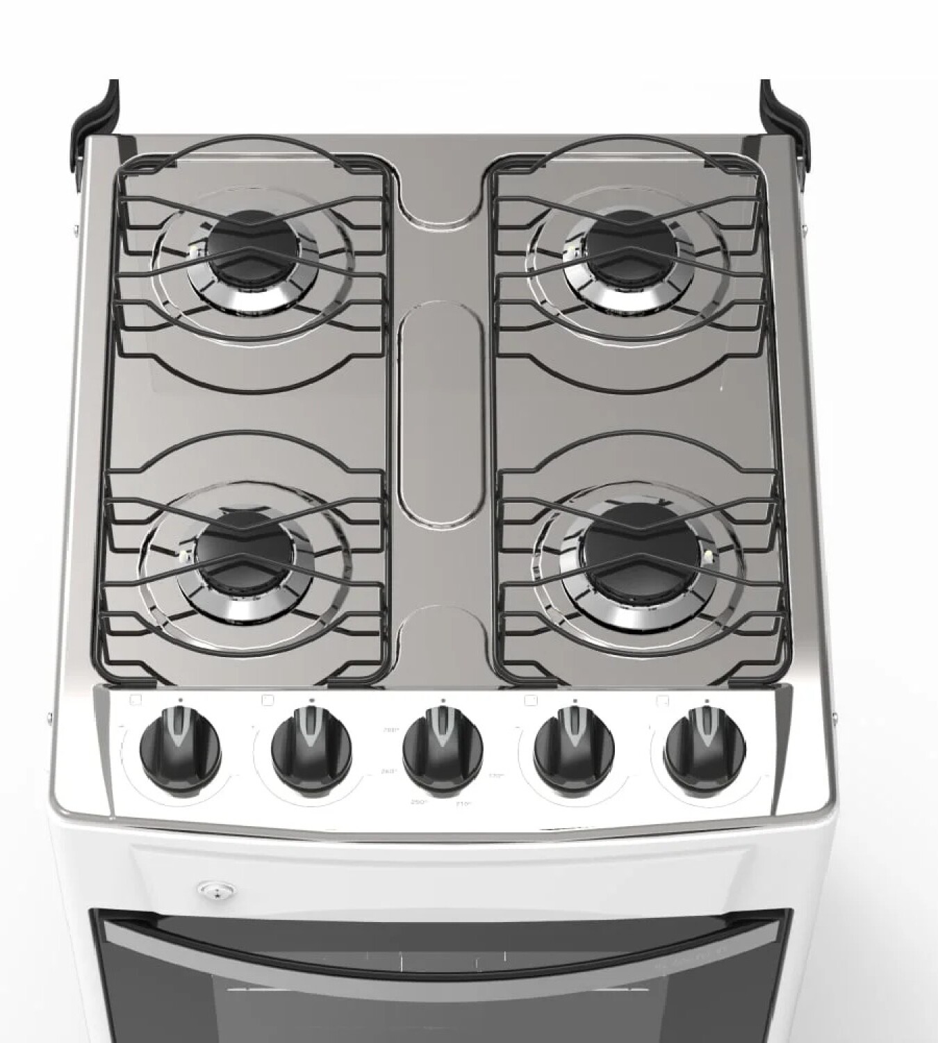 Cocina a gas 50 L con 4 quemadores y horno con puerta panorámica doble vidrio. Encendido electrónico, parrillas de hierro y acero inoxidable, luz interior y sistema de seguridad con termocupla. Práctica, segura y de gran rendimiento para tu cocina.