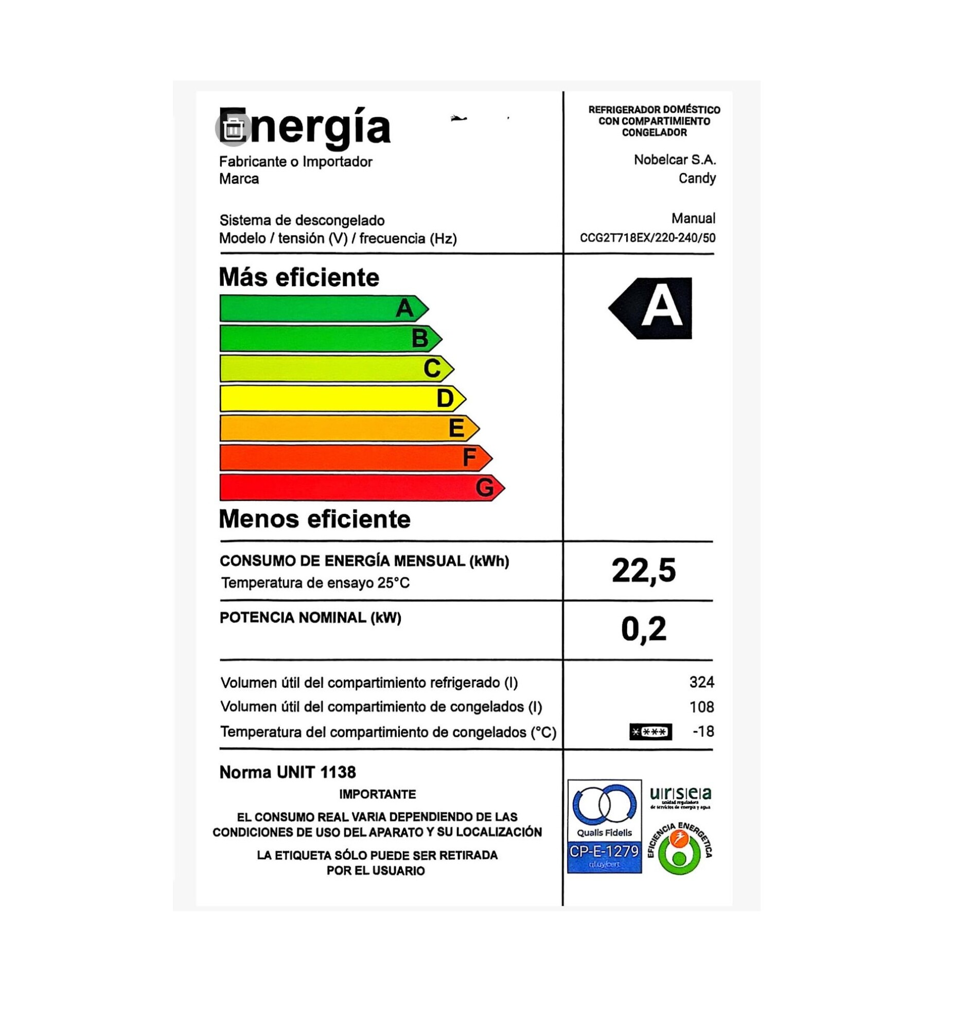 Capacidad total: 432L (Heladera 324L / Freezer 108L)