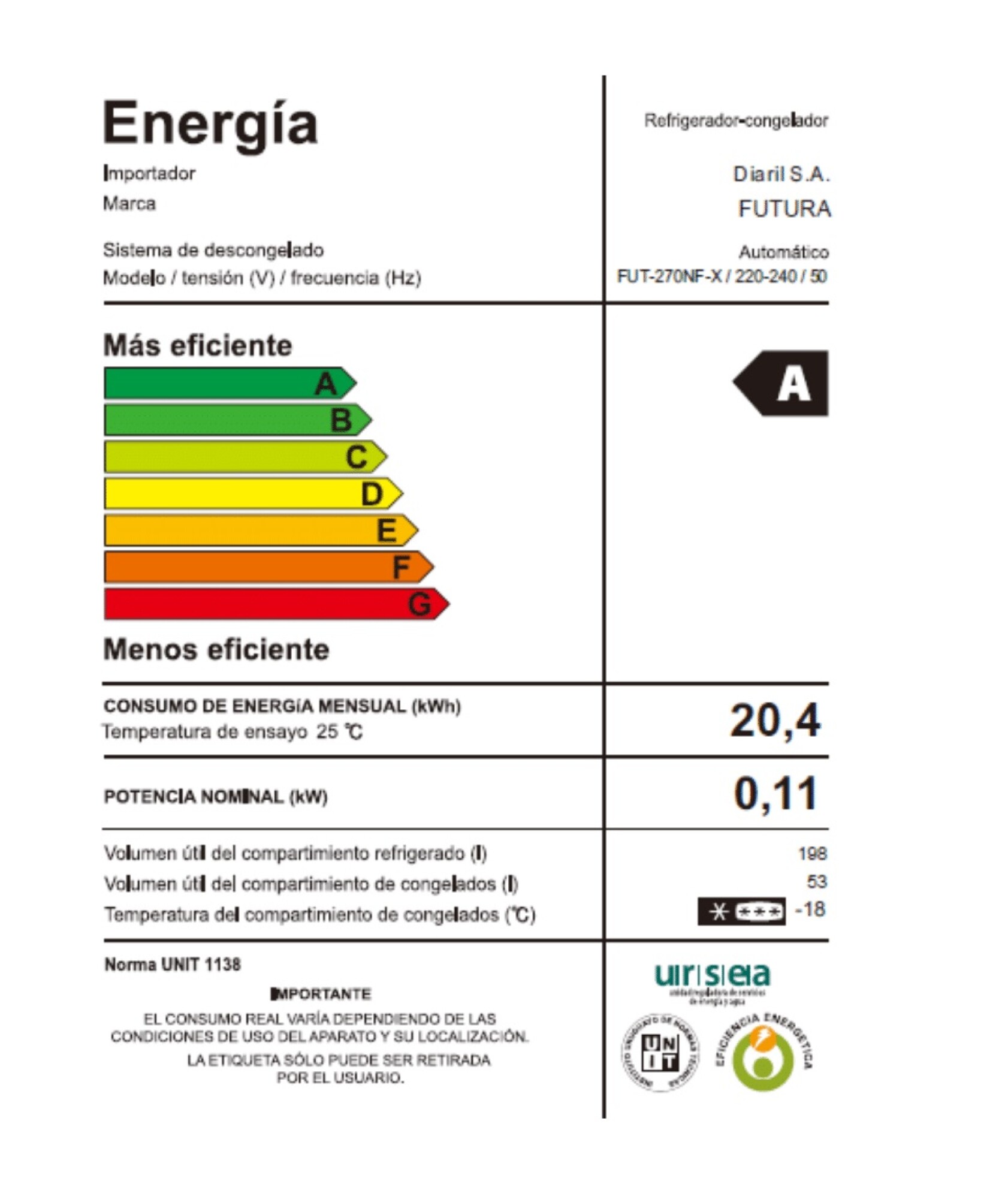 Heladera Futura de frío seco, con estantes anti derrame y control electrónico de temperatura.