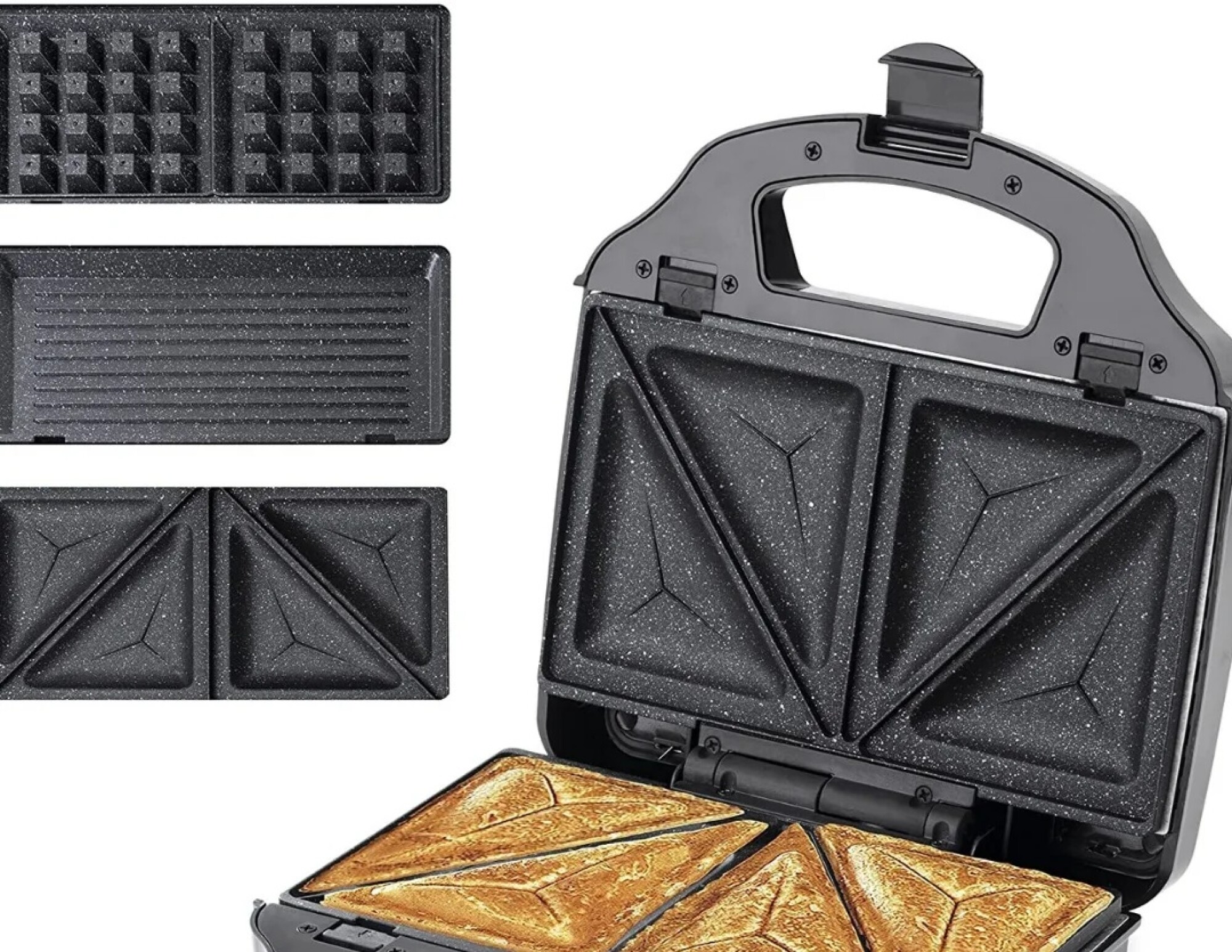Disfrutá desayunos y comidas rápidas con esta sandwichera 3 en 1 de 900 W, con placas intercambiables para sandwich, waffle y grill. Sus placas antiadherentes, indicadores luminosos y asa de tacto frío garantizan un uso fácil y seguro. Versátil, práctica.
